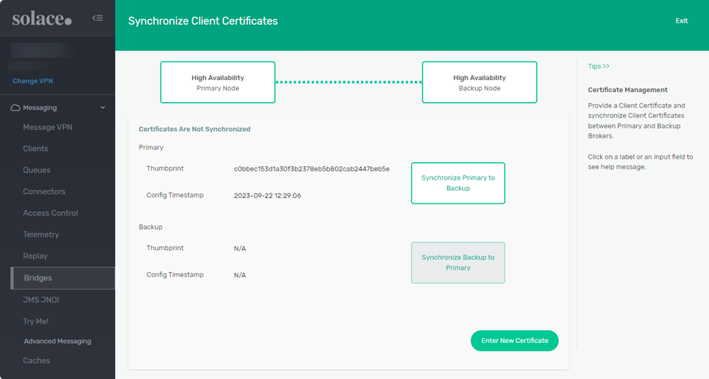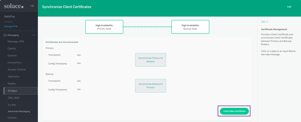 The Synchronize Client Certificates page opens. When no client certificate is installed on any node of the event broker service only the Enter New Certificate button is available.