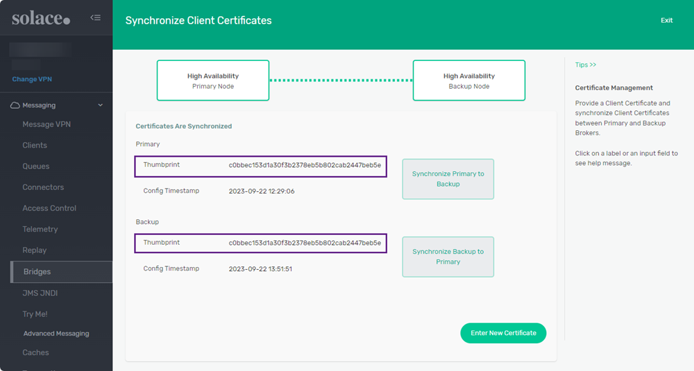 You can install client certificates on high availability (HA) event broker services in Message VPN and DMR bridges for added security. Event broker services with a client certificate in a bridge require other event broker services to authenticate. This can cause problems in a high availability event broker service because both nodes must have the same synchronized client certificate. If a node becomes active and it does not have a client certificate, or the certificate is out of synch, it may not authenticate with other event broker services in the bridge. You can use the Broker Manager to install client certificates on both nodes of an event broker service in a bridge. You can also use the Broker Manager to synchronize client certificates installed on the nodes of an event broker service in a bridge and if necessary, to replicate a client certificate from one node of an event broker service to the other node.