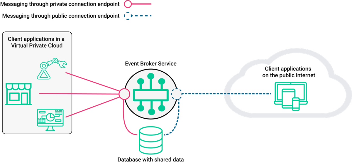 For Dedicated Cluster and Customer-Controlled Cluster deployments, the ability to configure both public and private endpoints on the same event broker service provides the flexibility to change access to your data as required. For event broker services deployed on Kubernetes-based infrastructure, you can edit your ports after service creation, including adding and deleting both public and private endpoints as required. This allows you to control access to your data and provide secure messaging using a single event broker service.