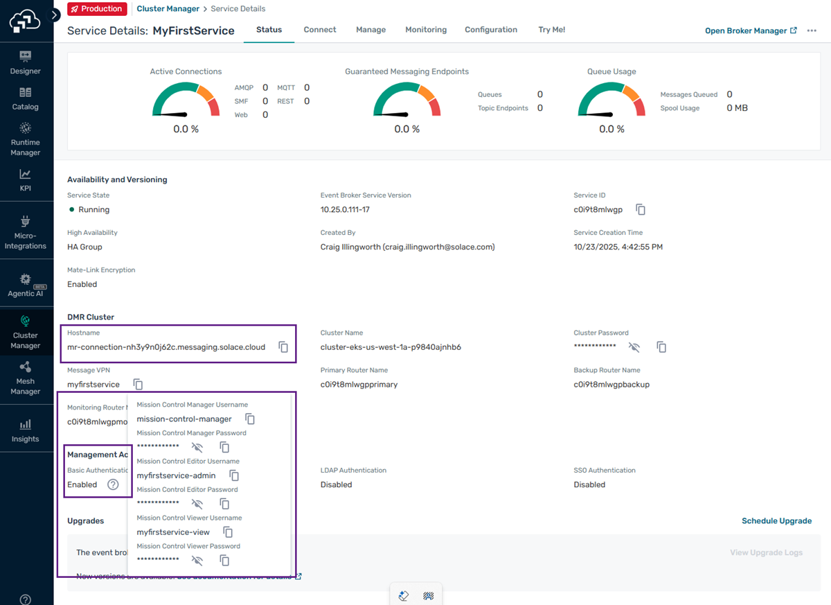 3. Under Management Access, hover over More Info and copy the required credentials. For more information, see Configuring User Access to Event Broker Services.