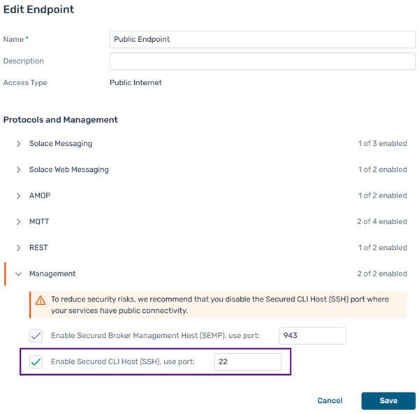 Solace recommends keeping CLI access disabled for public internet endpoints.