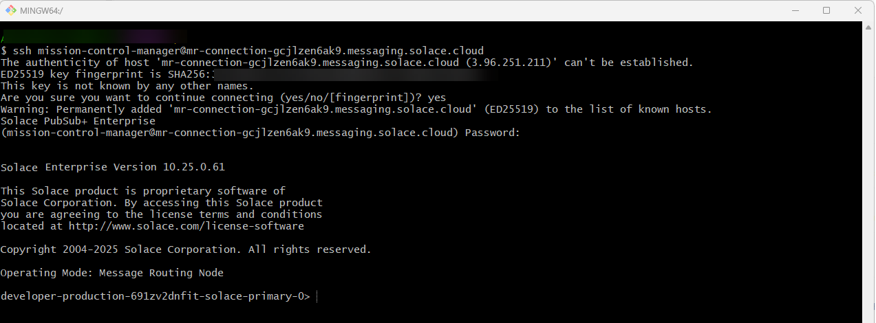 5. Once the connection is established, enter the management username and password to complete the login to the Solace Event Broker CLI. For example, below uses the ssh command.