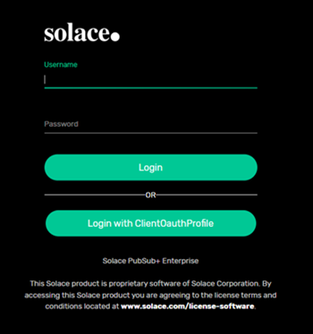 When configured successfully, users logging into an event broker service see a log in screen with the option to log-in with a username and password, using SSO through your OAuth IdP, as shown in the image below. After configuring and testing OAuth profile-based authentication, you can disable basic authentication, forcing users to authenticate through SSO. For more information, see Disabling Basic Authentication for Event Broker Service Management.