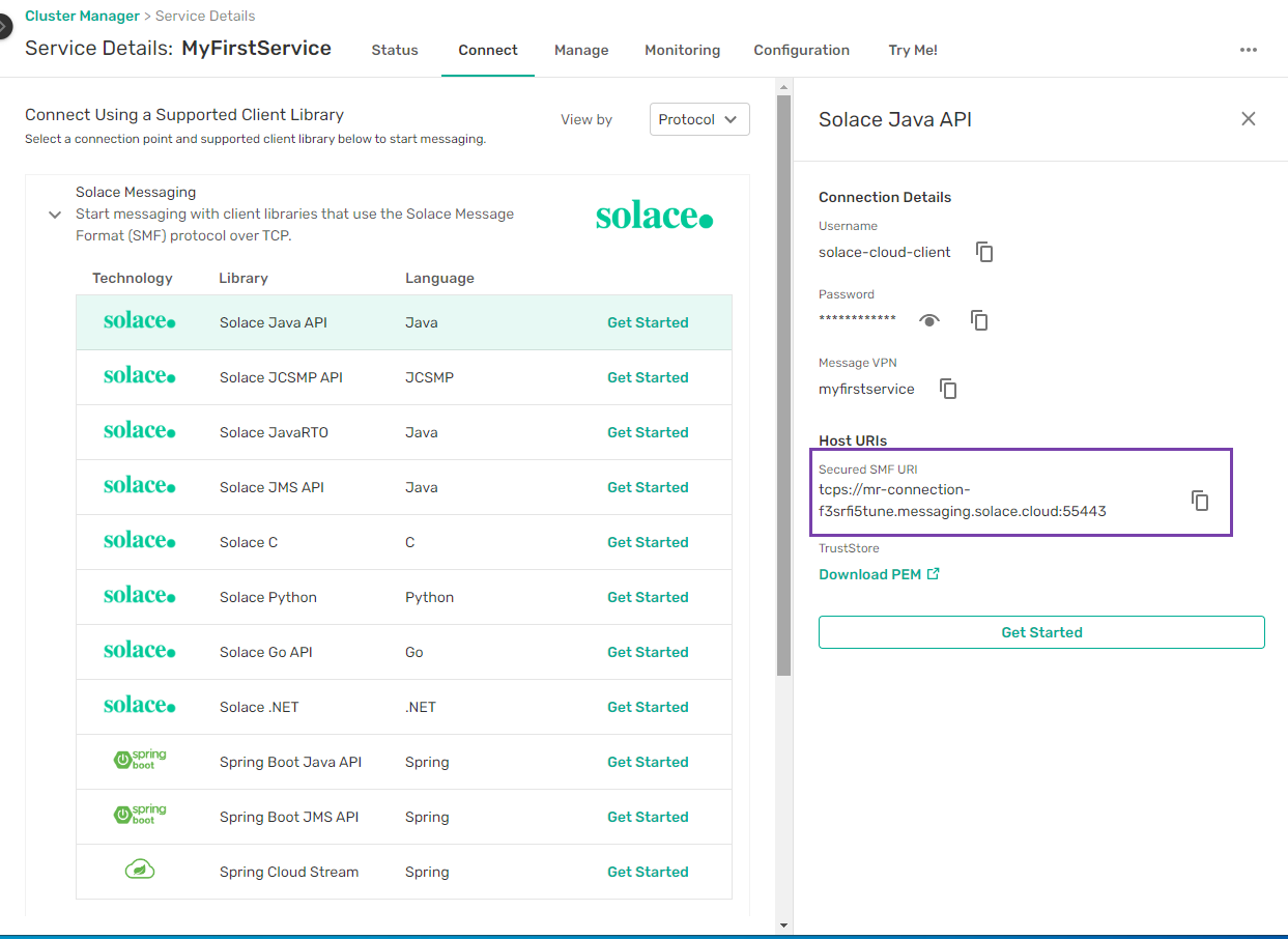 Solace Cloud automates all of the configuration and setup when you create your event broker service. Once the event broker service is created, applications can use the DNS name entry provided in the connectivity tab in the console.