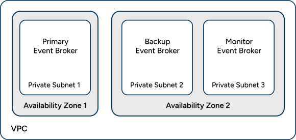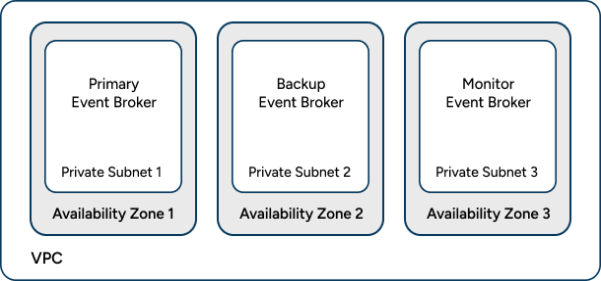 With this model, a primary messaging node provides messaging services to clients, while a backup event broker waits in standby mode—it only provides service should the primary event broker fail. A third event broker acts as a monitoring node, to act as a tie-breaker and prevent split-brain scenarios that would otherwise cause both the primary and backup messaging nodes to become active simultaneously.