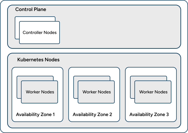 To ensure that an HA group is adequately provisioned, pods run on different worker nodes. Additionally, the pods can be spread over multiple availability zones (AZ) when available. The following diagram shows a Kubernetes cluster that has worker nodes over three AZs. The Mission Control Agent schedules the messaging nodes over two AZ and the monitor node on a third AZ. For each HA service, the primary pod is deployed in one AZ, the backup pod in a second AZ, and the monitoring pod in a third AZ. This guarantees that pods for the same HA service are not running on the same hardware.