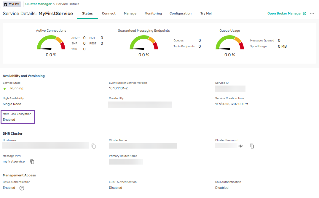 The status of the mate-link encryption for an event broker service is shown in Cluster Manager on the Status tab.