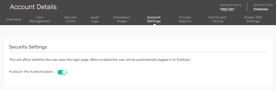 - On the Security Settings tile, enable or disable the Solace Pre Authentication toggle. When disabled, launching Broker Manager from the Cloud Console requires users to authenticate themselves for all new sessions. When enabled, users log in automatically when launching Broker Manager.