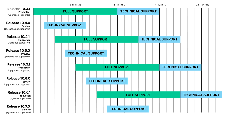 Because Preview releases are intended for feature introduction and integration rather than production purposes, they offer only a technical support phase. If you want to upgrade a Preview release, you can upgrade only to a newer Production release.