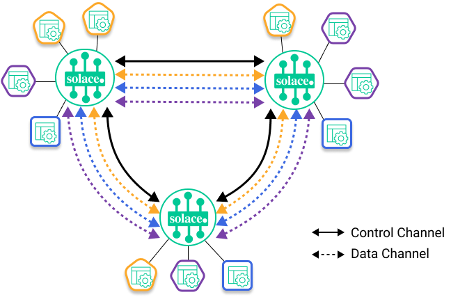 Here, the applications have been spread across all three software event brokers, which are interconnected with internal DMR links, with a combined capacity of 600,000 queues. This configuration can easily handle the needed number of clients, and scale even higher by adding additional software event brokers to the network over time. No manual subscription management is needed because DMR dynamically discovers the subscriptions needed by each event broker.