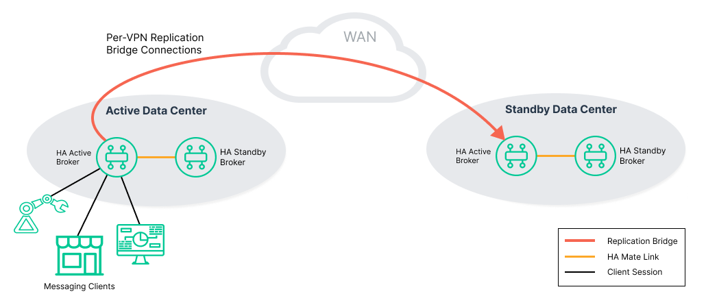 When replication is enabled, guaranteed messages that are published to a Message VPN with an active replication state at one data center are automatically propagated to matching Message VPNs with a standby replication state at another data center. The replication data center is typically located in a separate geographic location. In addition, if the messages are part of a local or XA transaction, the transaction is propagated to the standby site and the transaction semantics are respected. For example, rolling back a transaction would roll it back on both sites. Preparing an XA transaction would prepare the transaction on both sites. In a scenario where a major service outage occurs for one replicated data center (that is, one replication site), a service failover to the operational mate replication site can be performed.