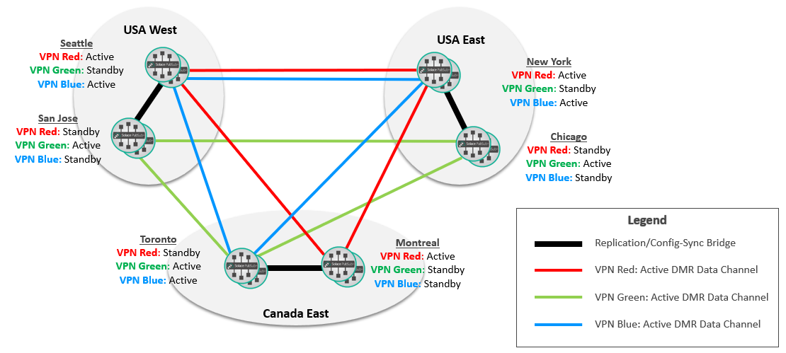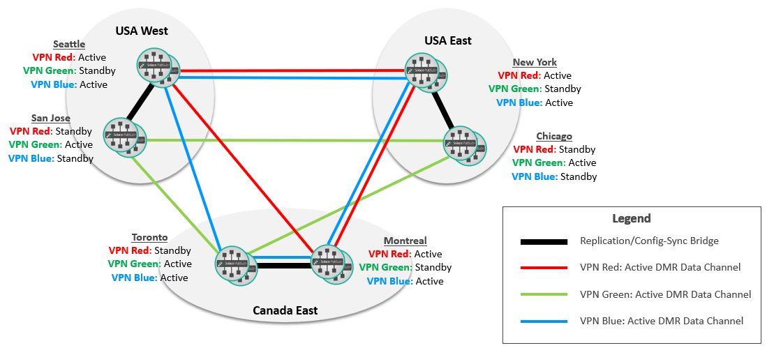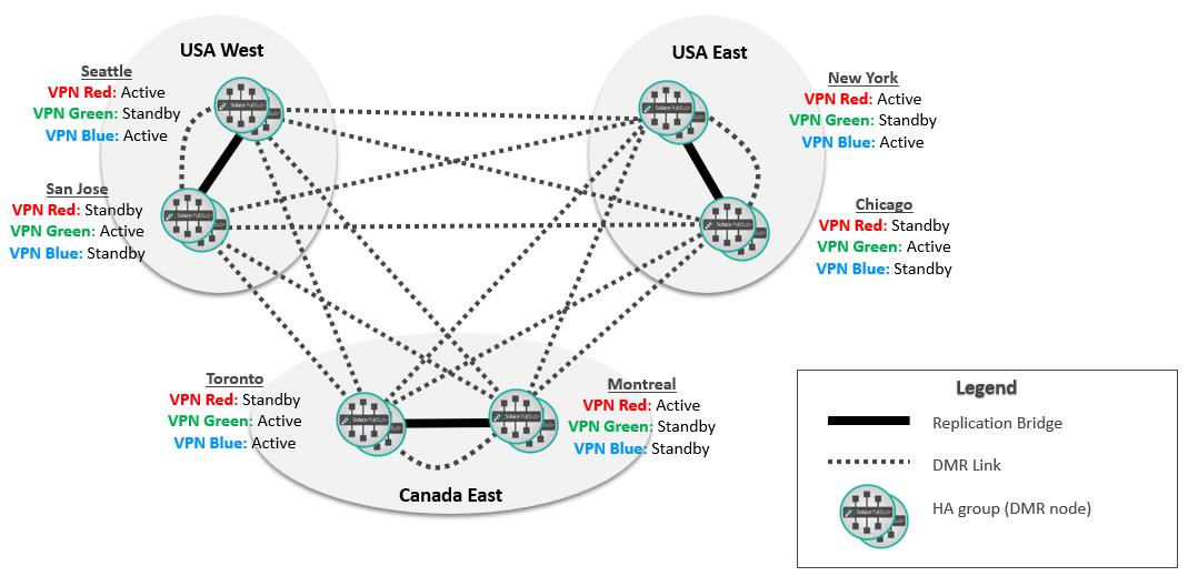 - in USA East, the New York and Chicago nodes form another replication group, with VPNs Red and Blue active in New York, and VPN Green active in Chicago.