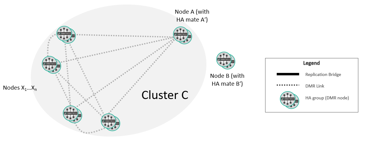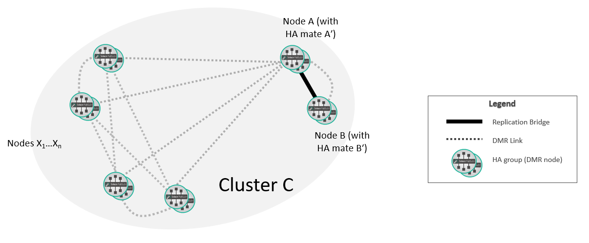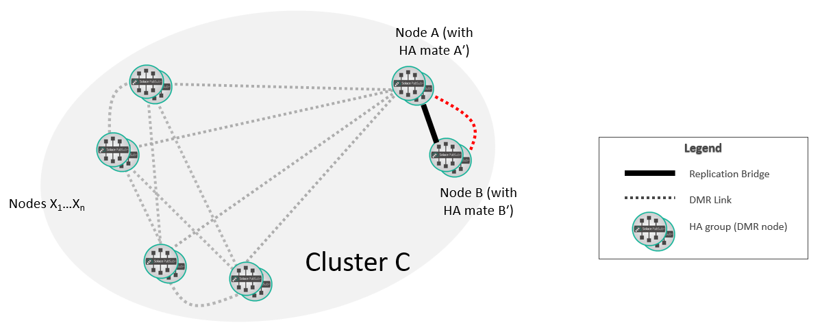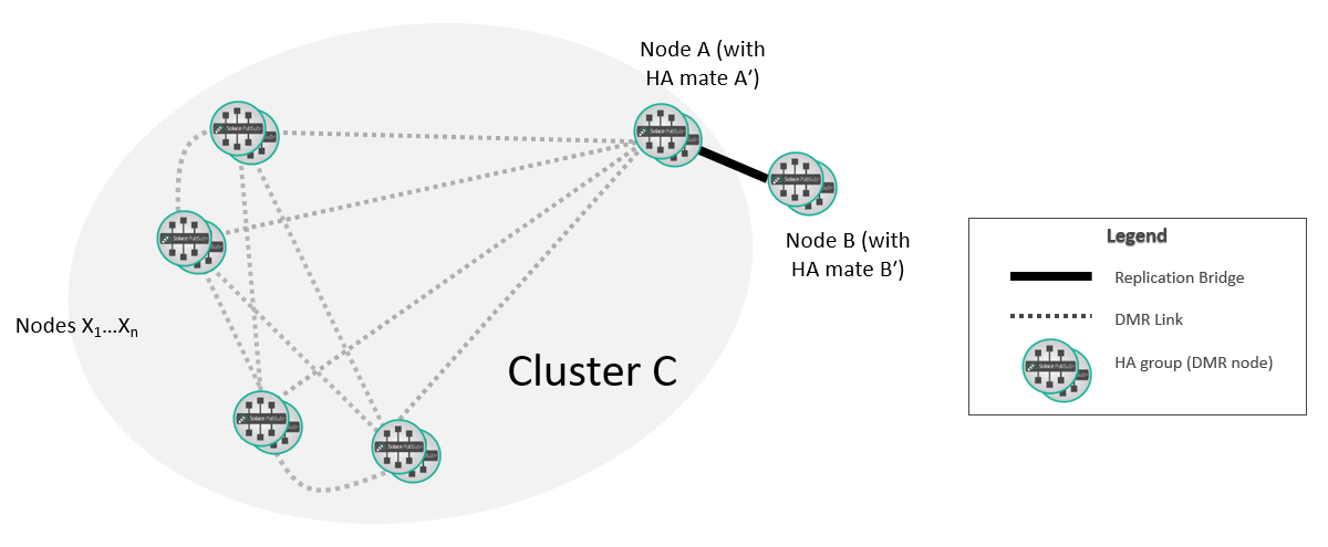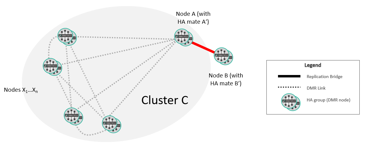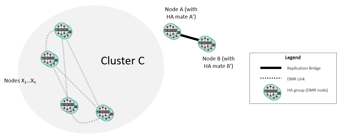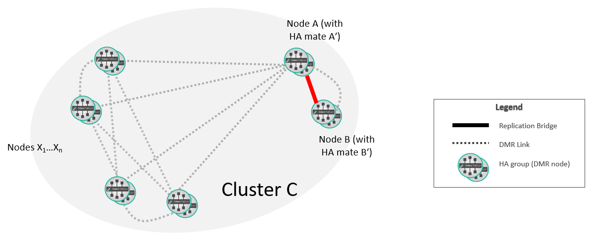 At this point, the new replication group A/B is fully integrated into the DMR network. If required, you can move the selected replicated Message VPNs on A so that they are active on B.