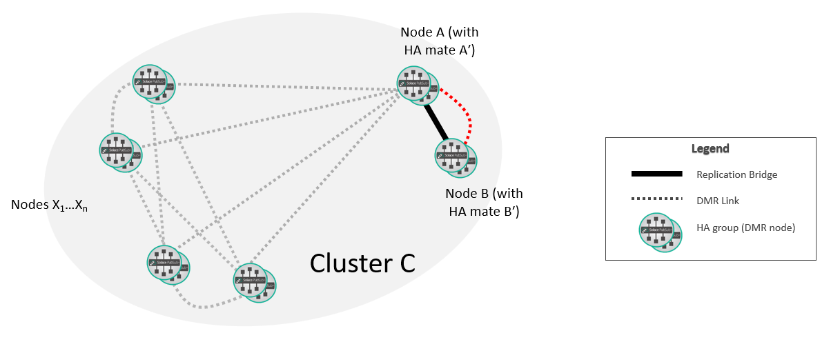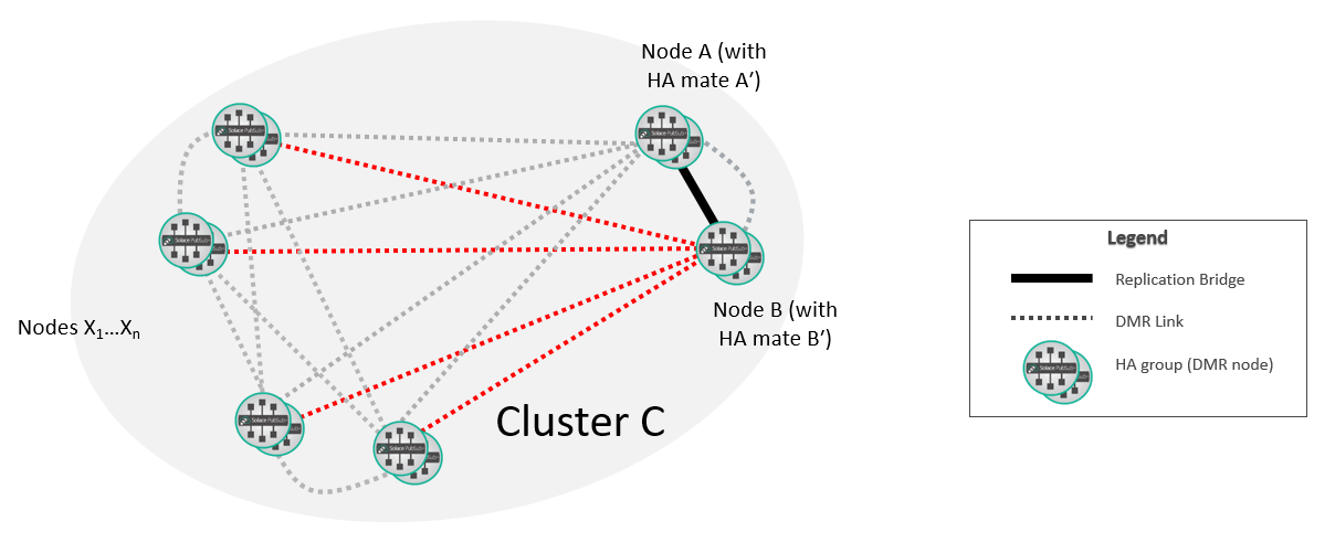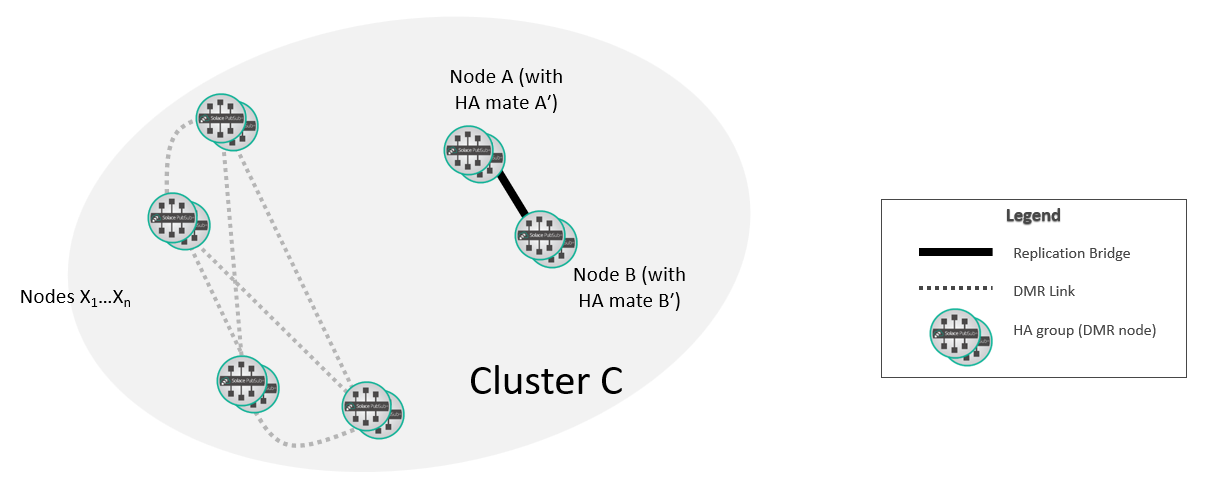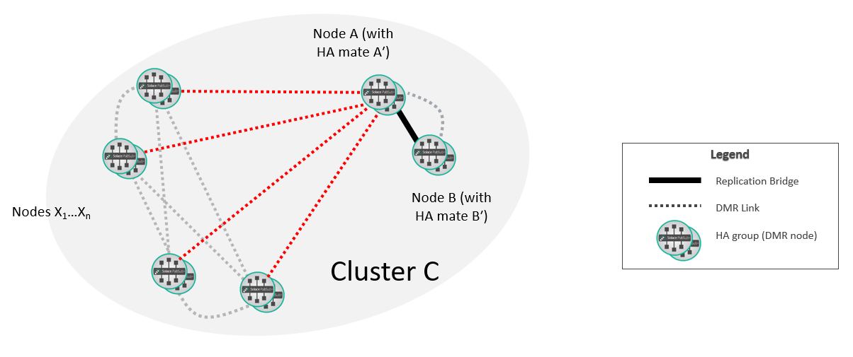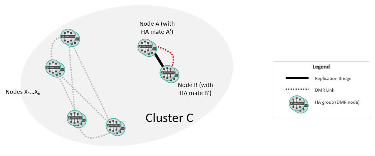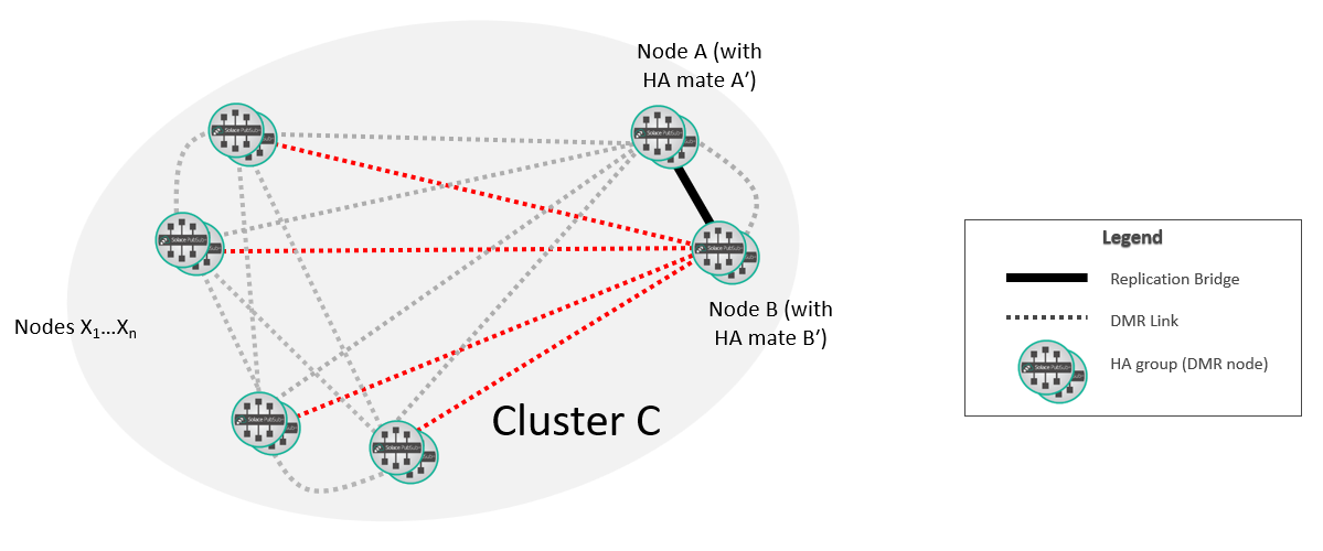 At this point, the new replication group A/B is fully integrated into the DMR network. If required, you can move the selected replicated Message VPNs on A so that they are active on B.