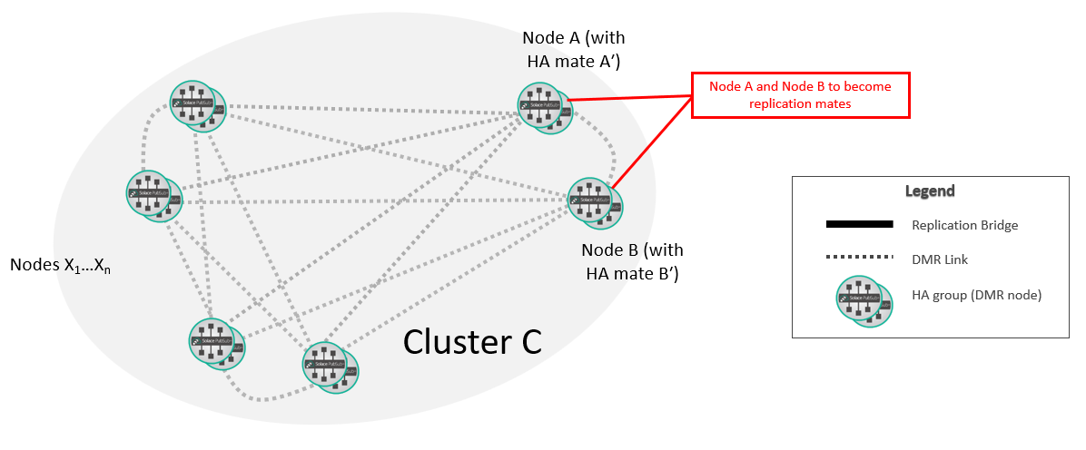 You can add a replication mate to a node in a DMR network without causing a service interruption to existing clients. During the procedure it is expected that the state of the cluster will be reported as DOWN and topology errors will be raised while links are being established between nodes. In spite of these errors, traffic will continue to flow through the network and no message loss is expected.