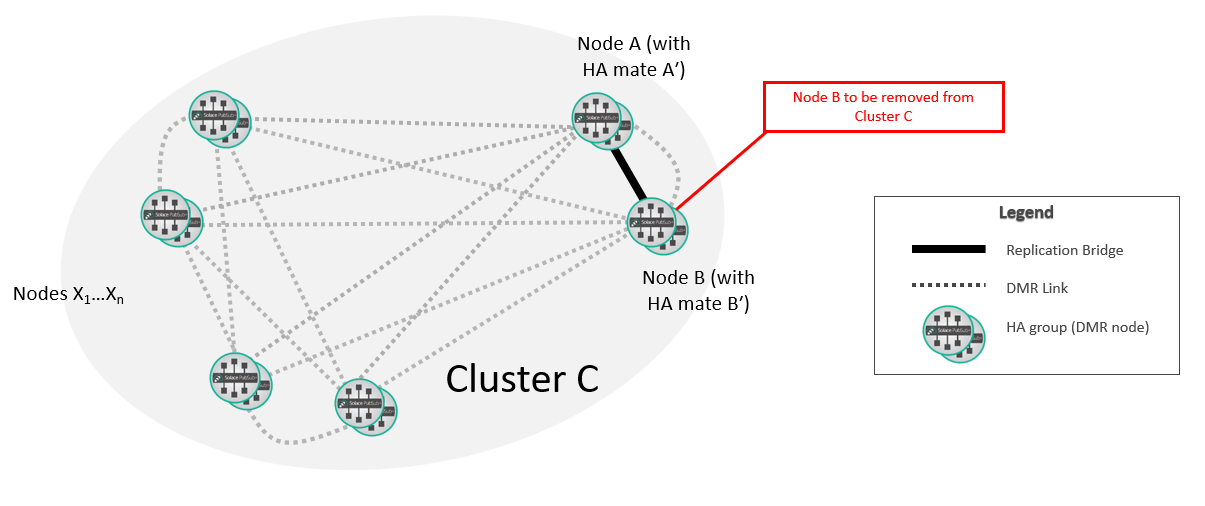 You can remove a replication mate from a node in a DMR network without causing a service interruption to existing clients if the node being removed is not hosting any clients (i.e. it is replication standby). During the procedure it is expected that the state of the cluster will be reported as DOWN and topology errors will be raised while links are being removed between nodes. In spite of these errors, traffic will continue to flow through the network and no message loss is expected.