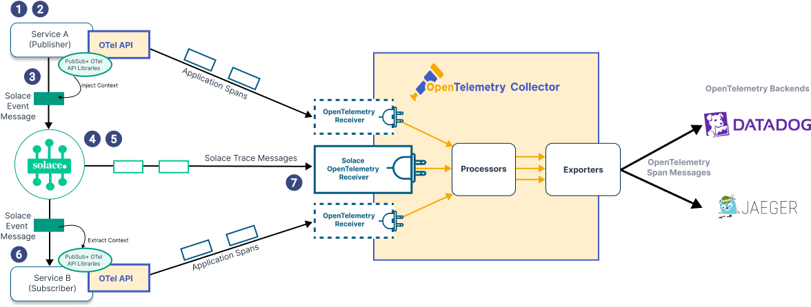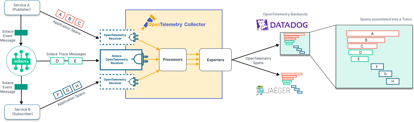 - At any time, the Solace OpenTelemetry Receiver can connect to the event broker to receive the Solace trace messages and convert them to standard OpenTelemetry spans. Other receiver modules receive the telemetry spans created by the producer and consumer applications. The OpenTelemetry Collector processes all the spans, which can then be correlated by a backend monitoring tool.