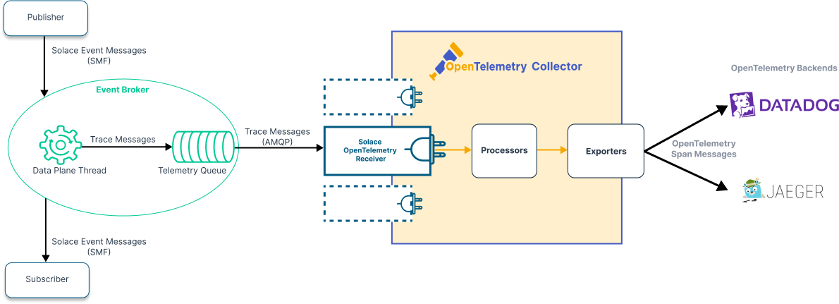 The Receiver consumes trace messages from a telemetry queue on the event broker and converts these messages into OpenTelemetry spans. The Collector then forwards these spans to your preferred OpenTelemetry backend (such as Jaeger, Prometheus, Zipkin, DataDog, DynaTrace, and so on).