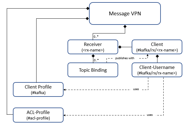 #kafka/rx/<rx-name>, and uses the client username#kafka/rx/<rx-name>. This client username uses the#kafkaclient profile and#acl-profileACL profile. -