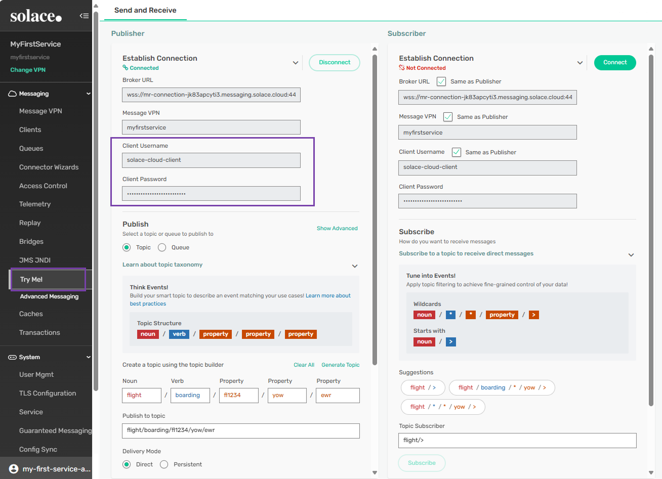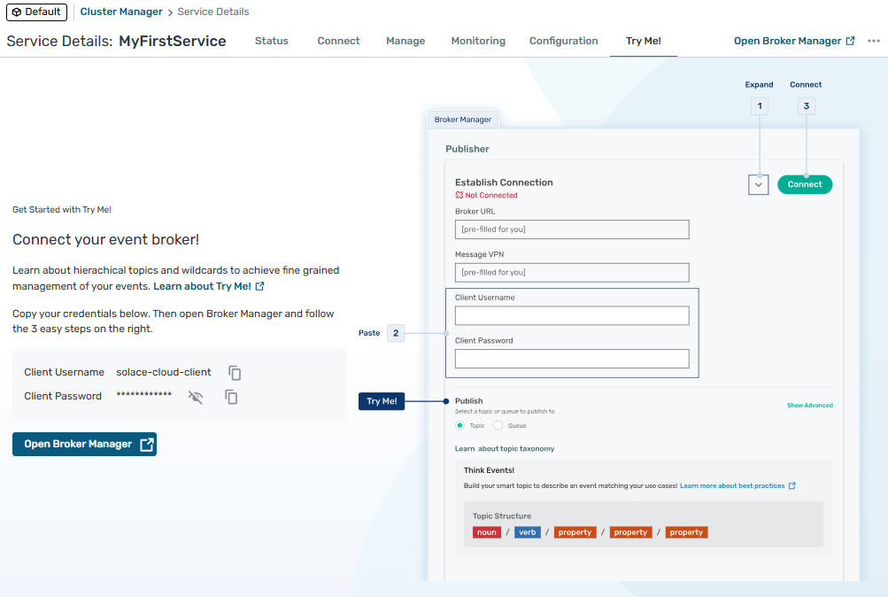 To connect to the event broker service copy the value for Client Password from the Try-Me! tab into Broker Manager and paste it into the Client Password field under Establish Connection.