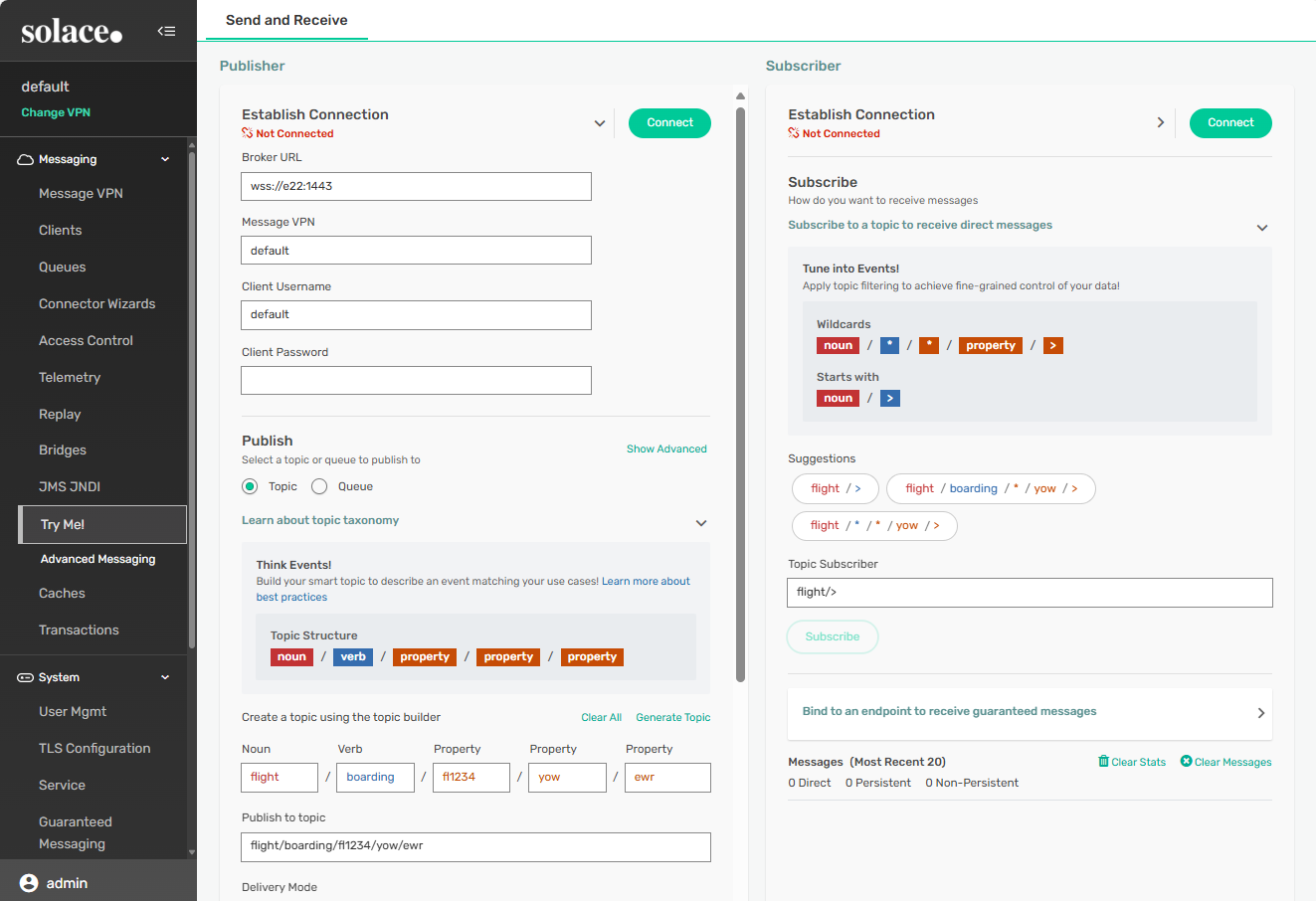 The software event broker has a default messaging client username (default) that doesn’t require a password to connect. If you haven’t changed any usernames, passwords, or URLs, you can use the provided default values to connect the Publisher and Subscriber to the event broker.
