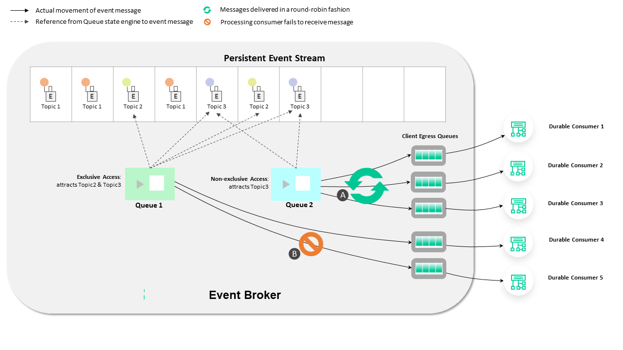 - If Durable Consumer 2 stops or disconnects its Solace Session to the event broker, it results in the associated Egress Queue being dissolved.