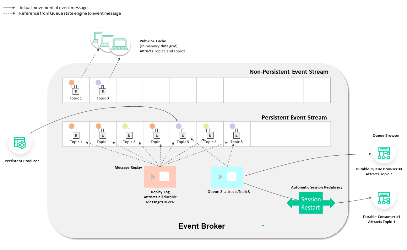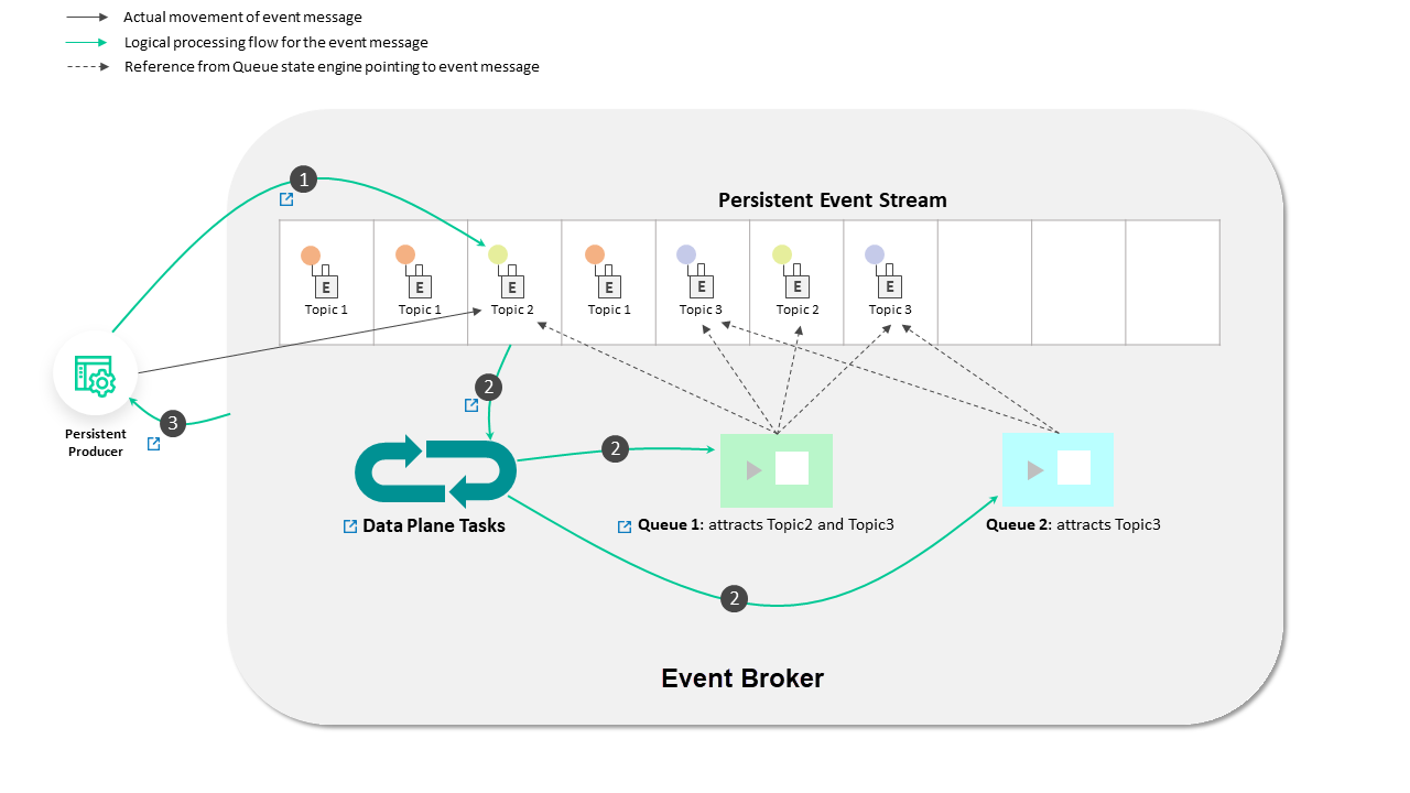 - Message producers send events with the header's Persistent Delivery Mode set to Direct. The messages are written to the tail of the Non-Persistent Event Stream based on the order they arrive at the broker. Suppose a message is sent with the Persistent Delivery Mode set to Persistent. In that case, it will also be added to the Non-Persistent Event Stream for those consumers who are subscribed to the topic but don't require message persistence.