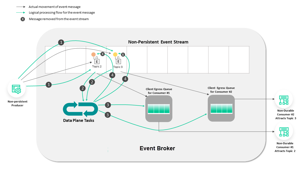 Messages in the Non-Persistent Event Stream are ephemeral, and message discard is acceptable. All messages, including messages that are flagged with a Persistent Delivery Mode set to Persistent or Direct are first placed into the Non-Persistent Event Stream when they arrive over TCP/IP. The Data Plane immediately moves messages flagged as Direct to the consumer's egress queue where the consumer has a matching topic subscription.