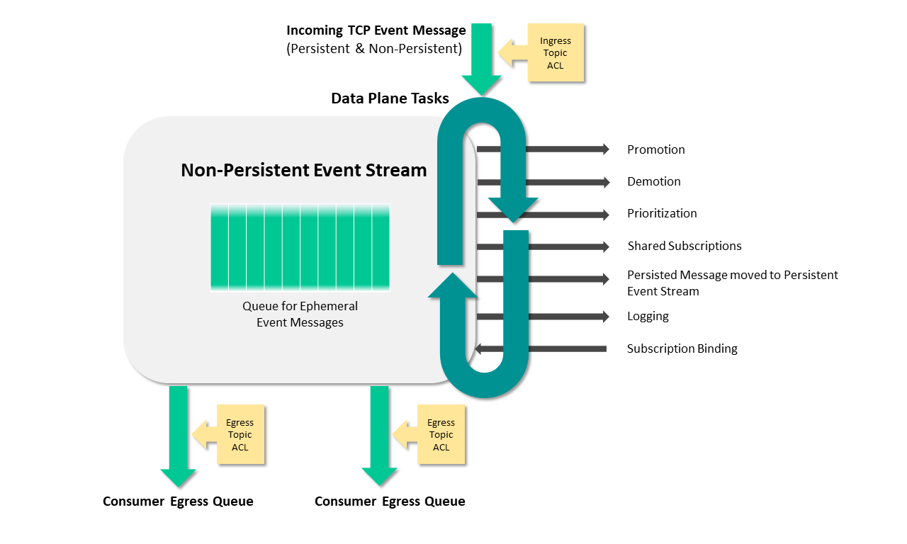 Once the messages pass the ingress ACL check, they are placed in the Non-Persistent Event Stream, and are further processed by the Data Plane, as follows: