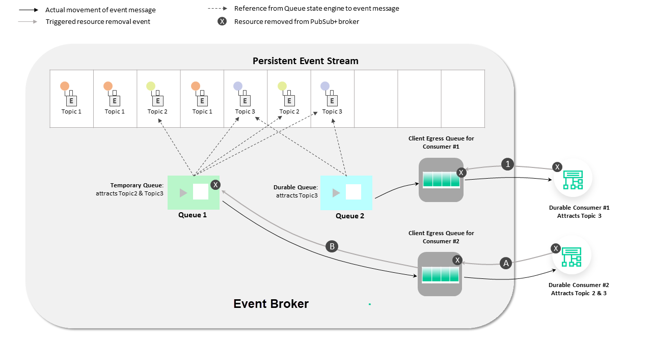 - There is no longer any consumer associated with the Temporary Queue 1 so it is also dissolved and all references to the Persistent Event Stream are dissolved.