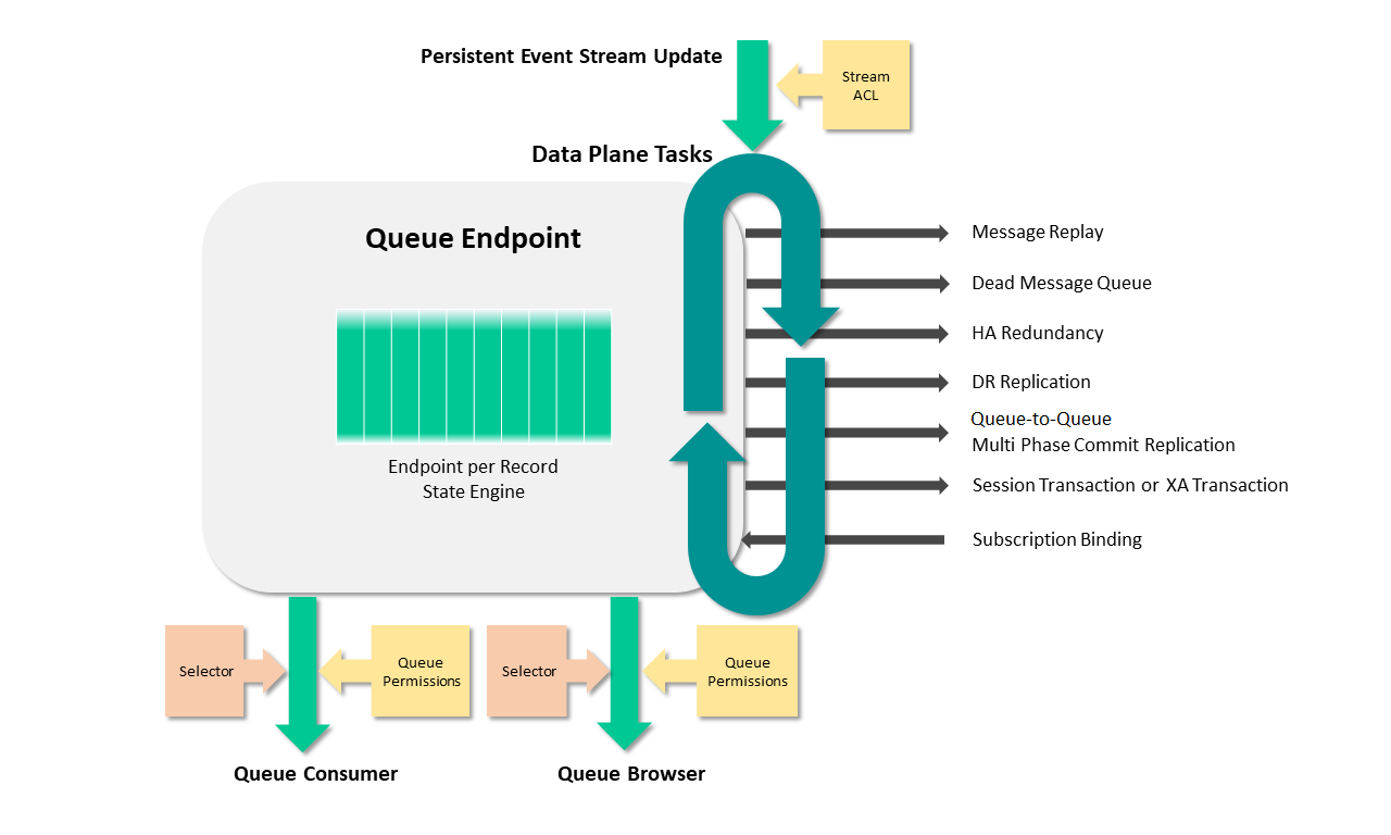 The Data Plane operates on queue endpoints. For persistent event messaging, a queue endpoint maintains state for all messages in the Persistent Event Stream that are targeted directly to the specific queue, or are part of the queue's topic subscriptions. There are three main functional categories associated with a queue endpoint: