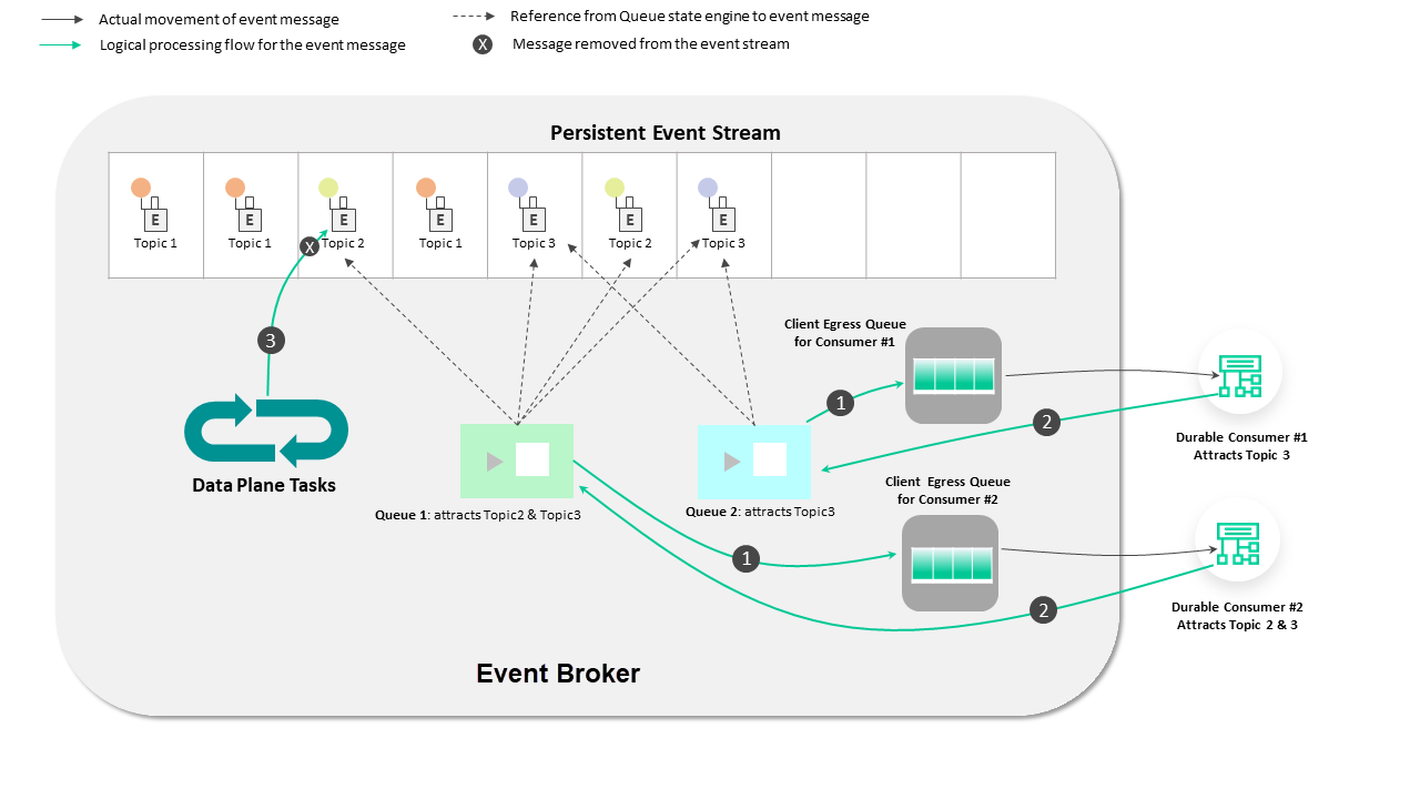 - Once all consumers that have registered interest in the same topic message, and their Egress Queue schedulers have moved the message to the TCP output queue, the message is deleted from the Non-Persistent Event Stream. See Direct Messages for more information.