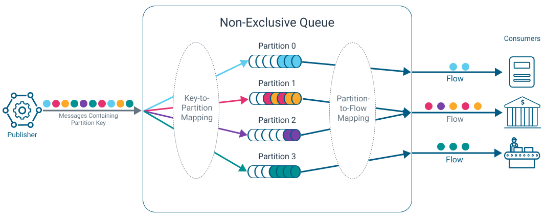 The diagram below shows messages being published to a partitioned queue. The different colors of the messages represent their partition key value. Each partition key value is mapped to one partition. However, a partition might be mapped to more than one partition key value.