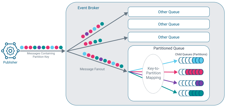 The diagram below illustrates a sequence of messages arriving in the event broker, and then being fanned out to some queues, one of which is partitioned. In the partitioned queue, the key-to-partition mapping determines which messages go to which partitions.
