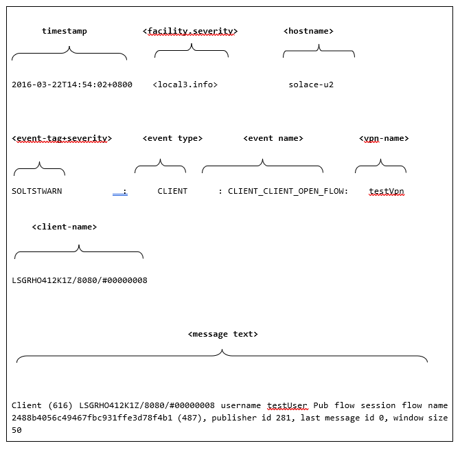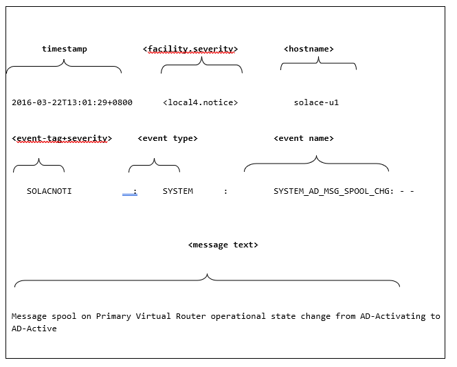 Event broker Syslog messages belong to a facility, which is a group of messages that are either generated by the same software process, or concern a similar event broker subsystem condition or activity (such as debugging attempts). These are shown in following sections for each of the three Solace event types.