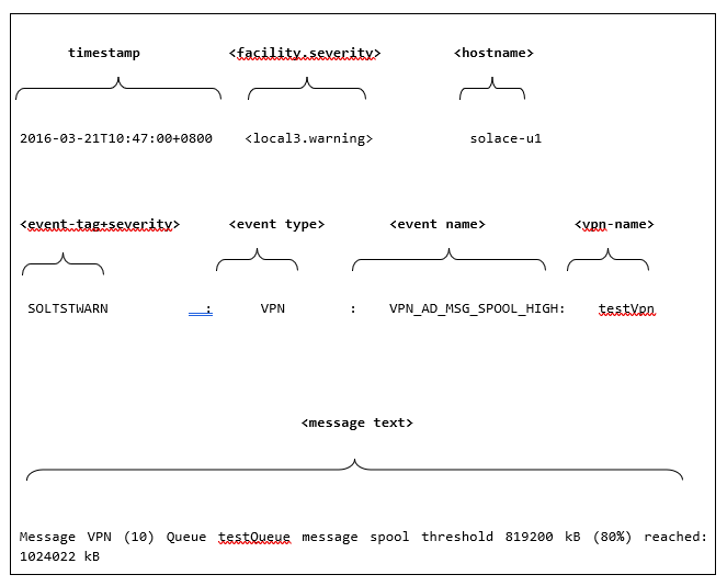 2016-03-21T10:47:00+0800 <local3.warning> solace-u1 SOLTSTWARN : VPN: VPN_AD_MSG_SPOOL_HIGH: testVpn - Message VPN (10) Queue testQueue message spool threshold 819200 kB (80%) reached: 1024022 kB