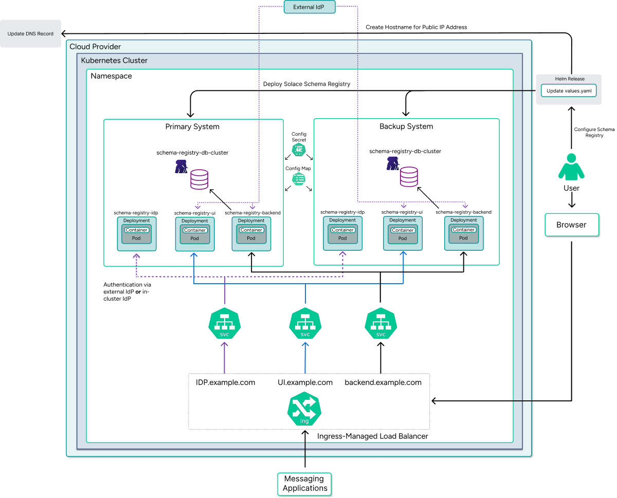 The diagram below illustrates the Kubernetes deployment architecture of Solace Schema Registry: