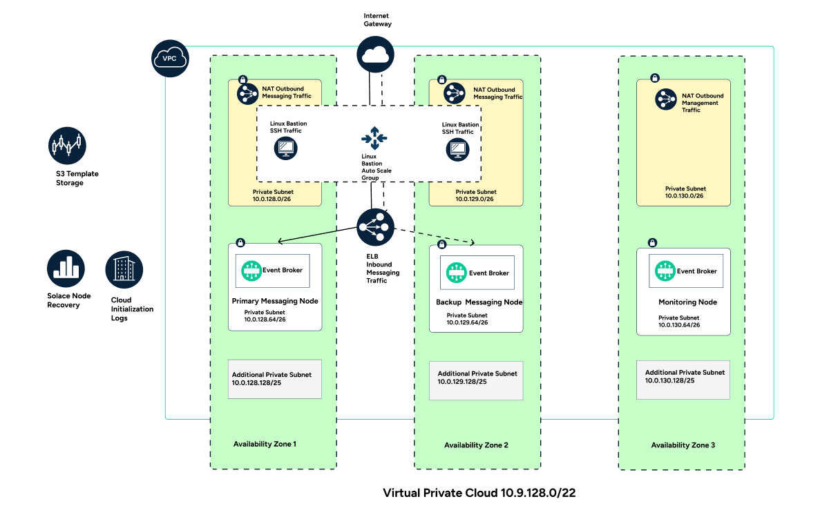 The diagram below illustrates a high-availability (HA) event broker set up in AWS public cloud infrastructure. The Internet Gateway at the top is the exterior connection to the Internet. Below the Internet Gateway is the DMZ layer that contains NATs, Bastion Hosts, and ELB. The DMZ layer prevents direct connections to and from underlying resources—in this case, the event brokers. The ELB acts as a load balancer/traffic director and a firewall, thus mitigating and preventing any denial of service and TCP level attacks. Below the DMZ layer are the Solace event brokers; they are protected by the upper layer and are not directly addressable from the Internet. The event brokers terminate the NAT’ed TCP connections, do authentication and authorization, and may terminate TLS connections. They do not directly forward IP or TCP traffic to applications but instead re-encapsulate data in internally addressed connections. The final layer at the bottom is where the applications sit. They are only reachable from the event brokers and possibly from the Bastion jump boxes.