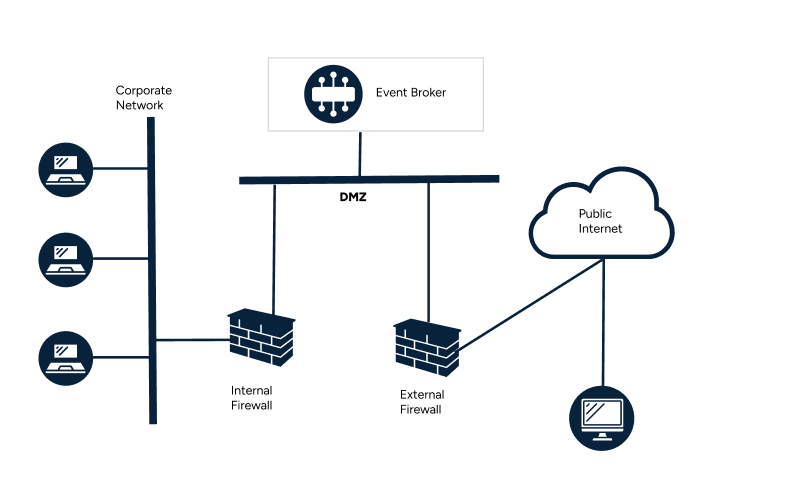 Internal hosts that do need to accept external connections sit between these two firewalls (that is, between the public internet and the corporate network) in a network commonly called a Demilitarized Zone (DMZ). Using an event broker in the DMZ allows external clients to connect to and access internal services without requiring those internal services to accept external connections, as shown in the diagram below. While it is possible to have separate network interfaces for internal- and external-facing traffic, it's not needed.
