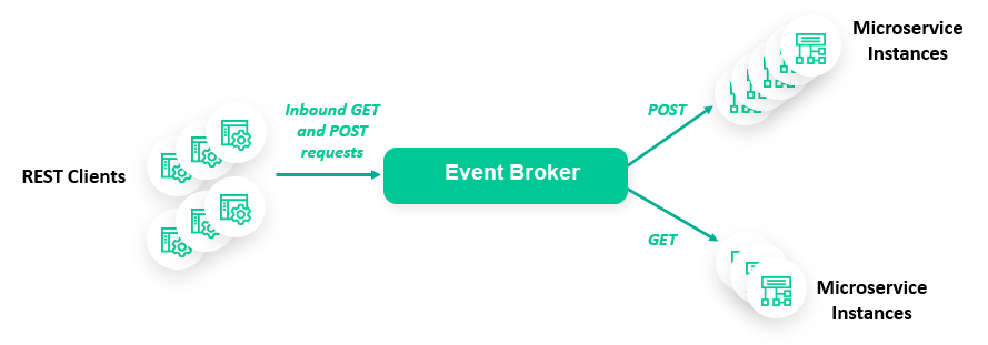 Event brokers are capable of efficiently load balancing incoming REST requests to a number of remote consumers (refer to REST Consumers); however, the URI to topic encoding provided by the Microgateway also enables you to calibrate the load balancing functionality by request method.