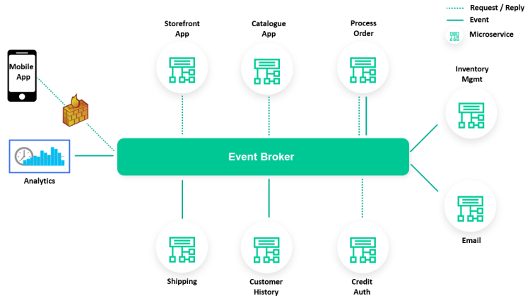 The following diagram provides an example of a hybrid event-driven architecture. In this example, a front end mobile application and multiple back end microservices (including a real-time analytics application) are all connected to the Solace message bus. Both request/reply and pub/sub delivery methods are used depending on the objective of each microservice.