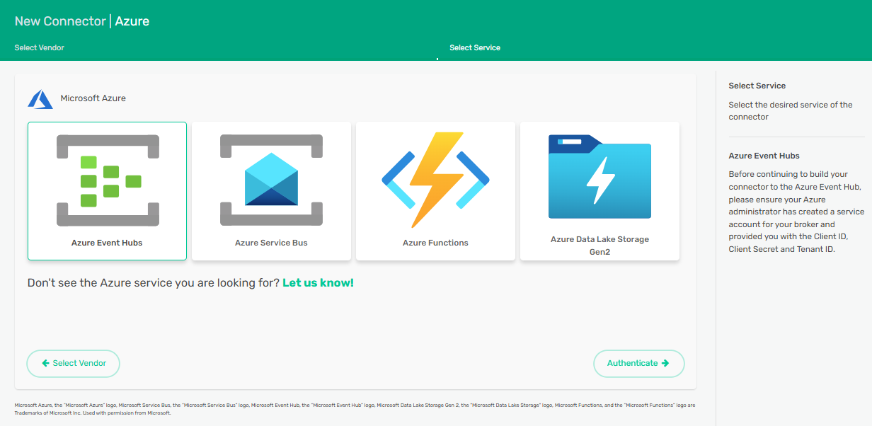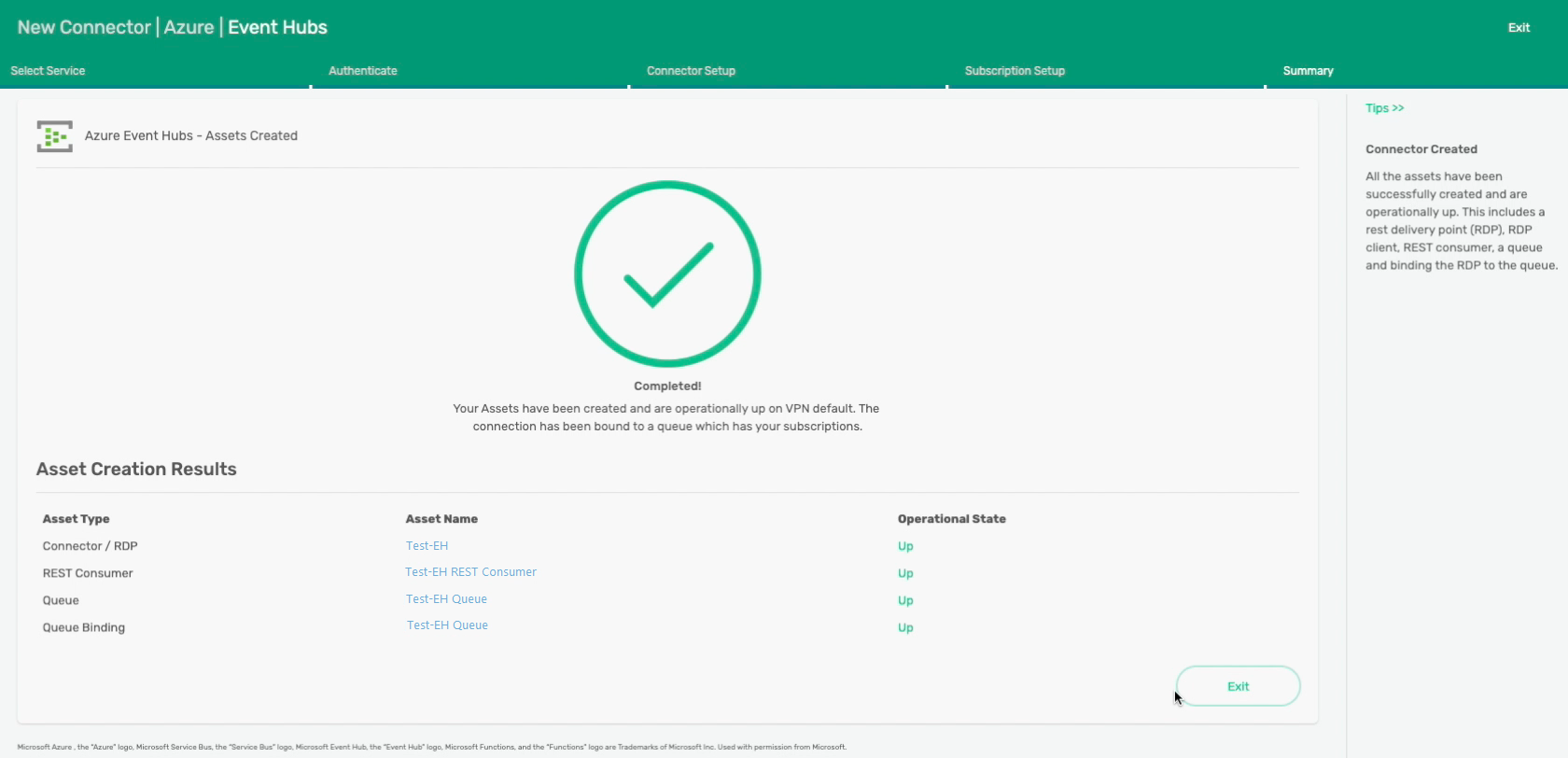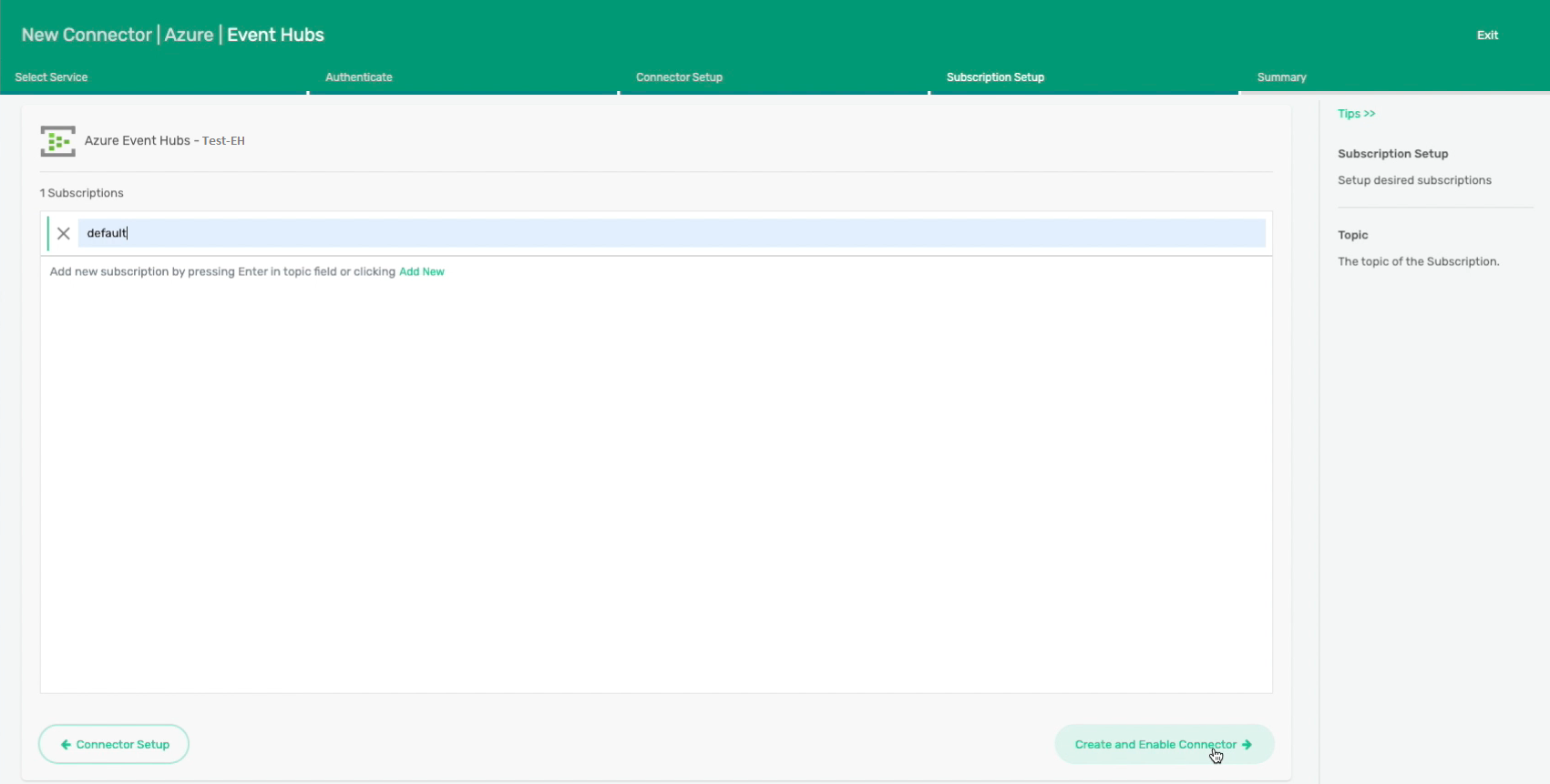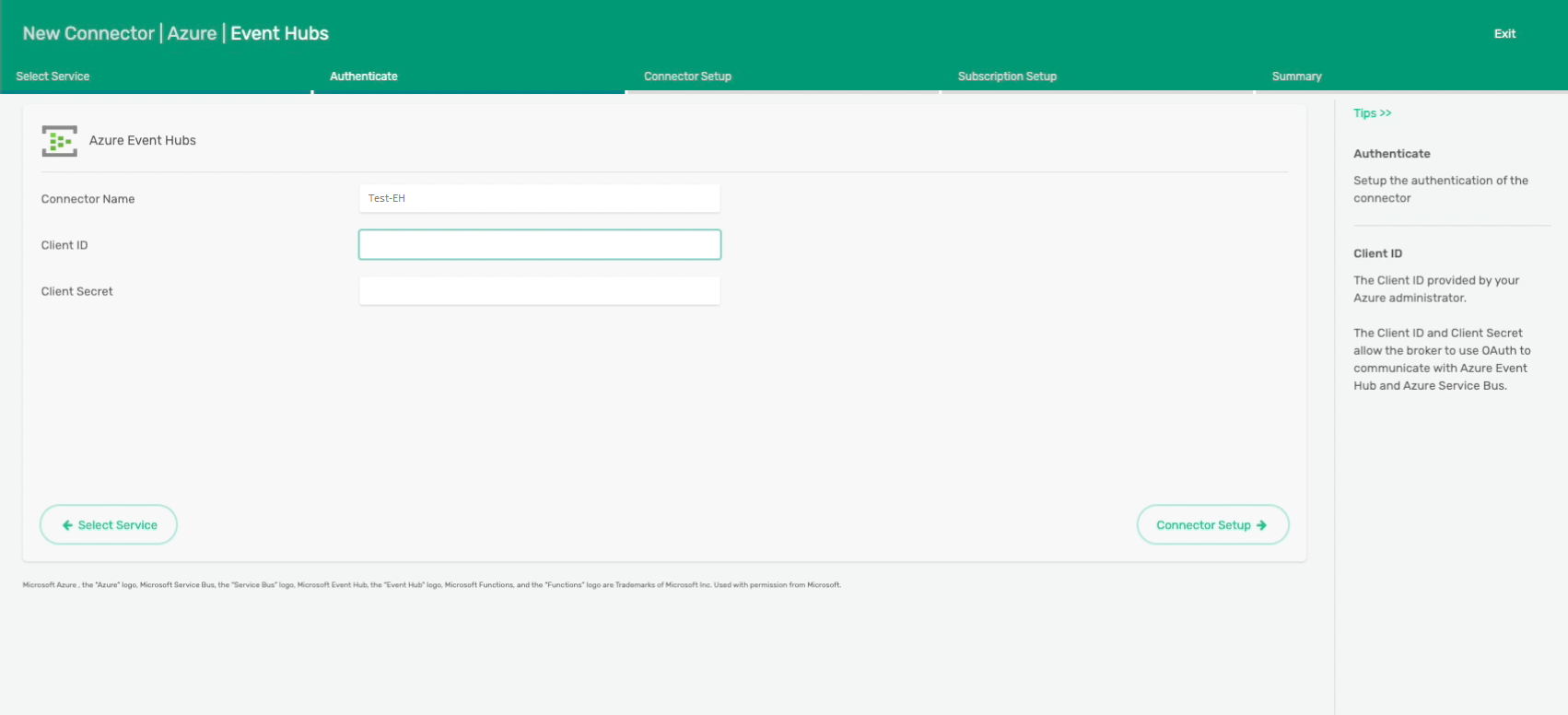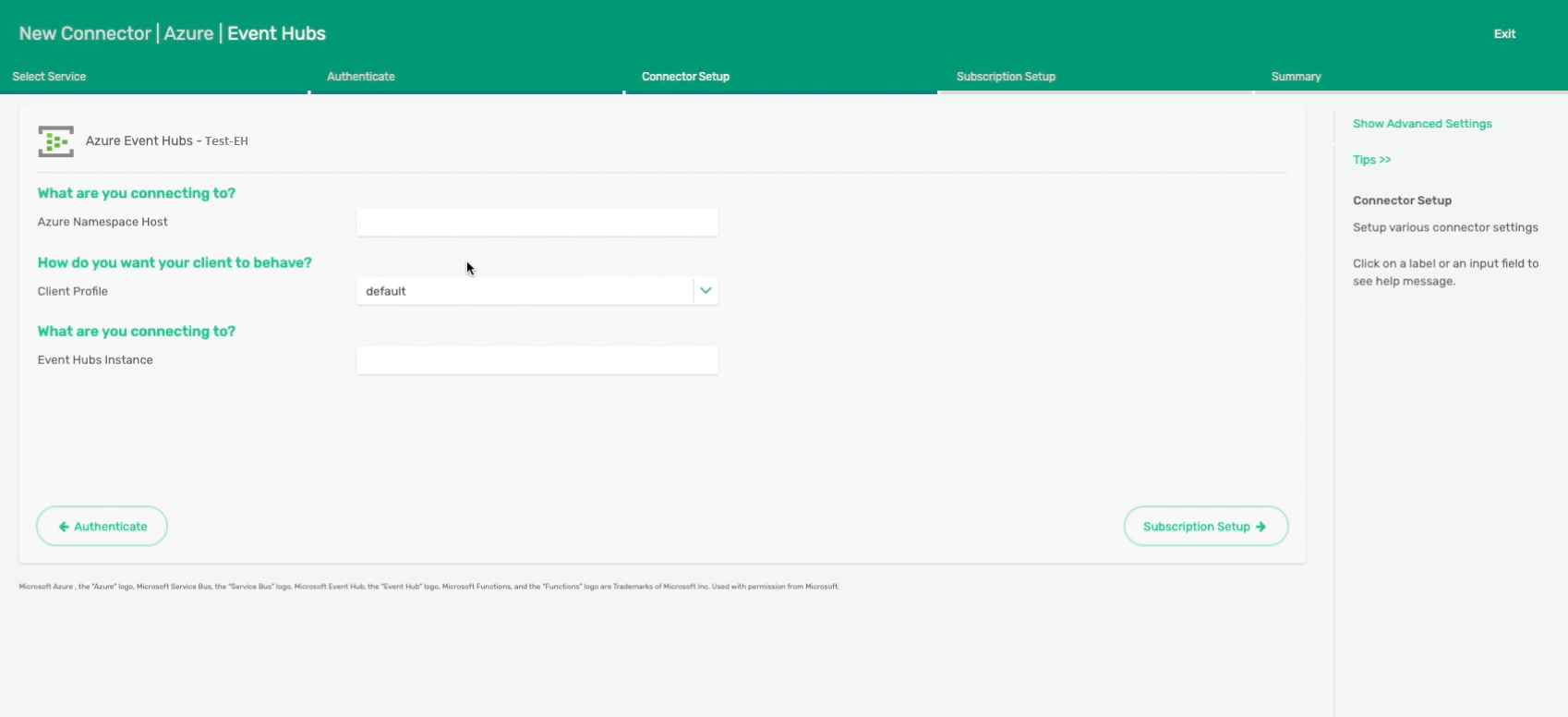 Once the authentication has been established, enter the Azure Namespace Host , Event Hubs Instance name, and configure the client profile accordingly.
