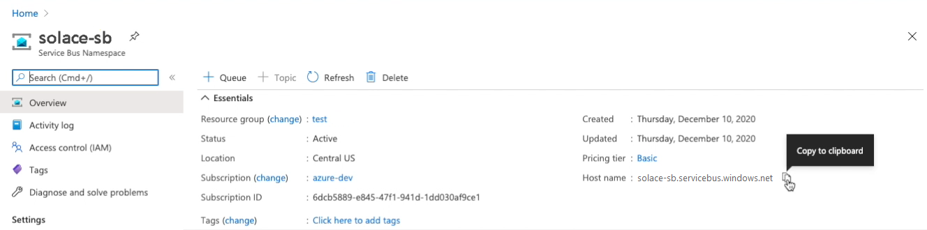 For the Azure Namespace Host, use the Service Bus Namespace Host name.