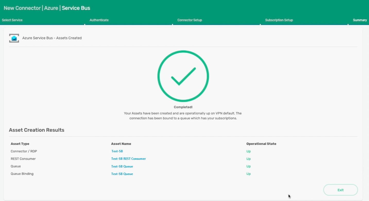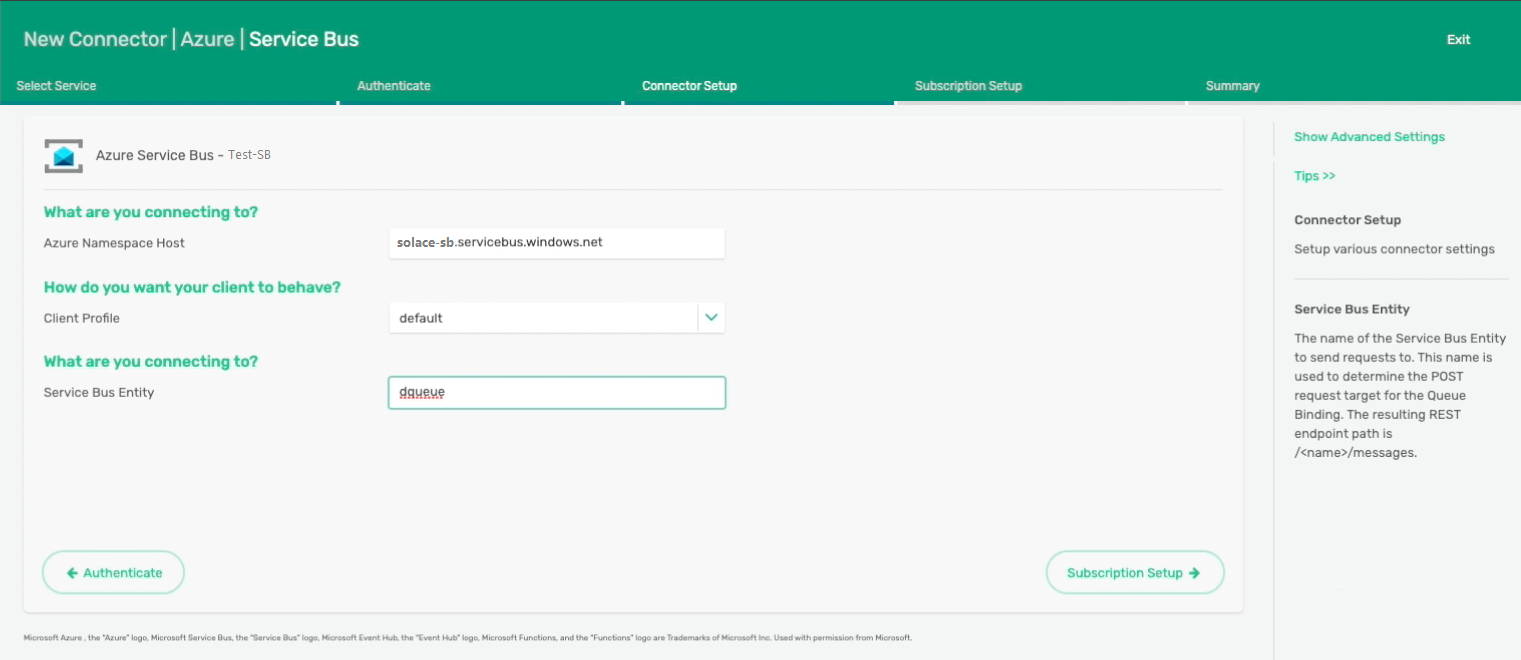 Once the authentication has been established, enter the Azure Namespace Host, Service Bus Entity, and configure the client profile accordingly.