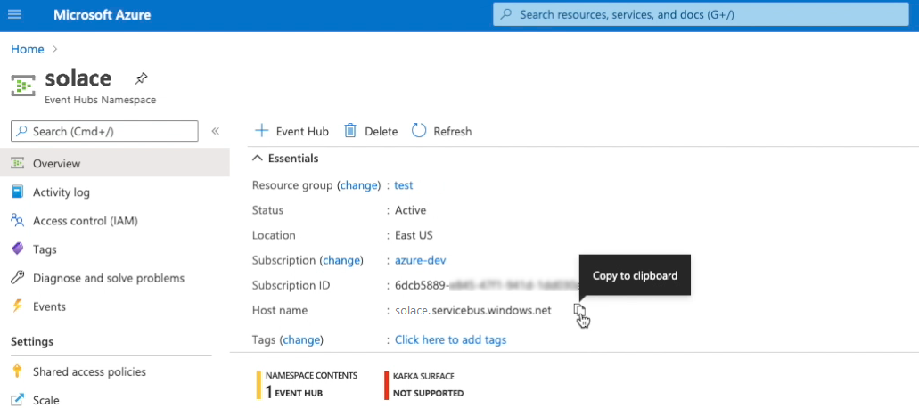 The Azure Namespace Host is the Host name of the Event Hubs Namespace.