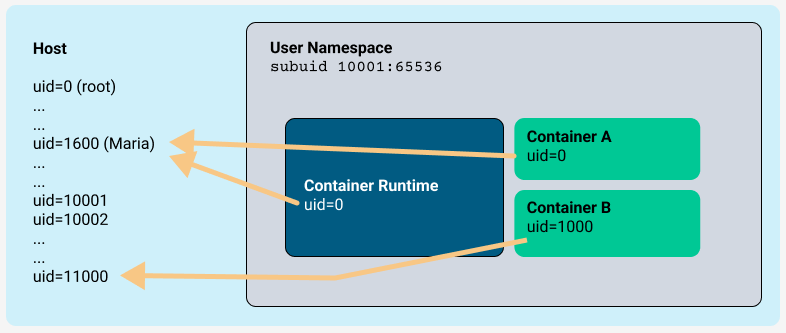 This means that processes within Maria's user namespace map to host UIDs starting at 10001. Because the container runtime launches the containers, the container processes also belong to Maria's user namespace.